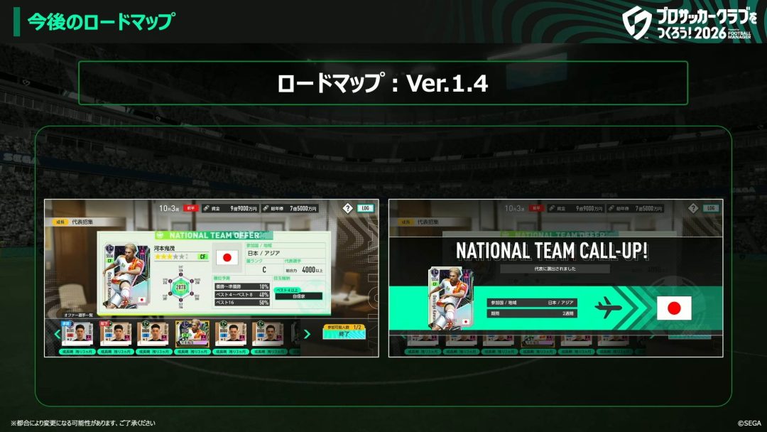 Ver.1.4とVer.1.5の2段階で追加される国際大会向け機能も、注目に値するものだ。ちょうど6月11日からはサッカー界の4年に一度の祭典であるワールドカップが開催されるため、その雰囲気を『サカつく2026』でも味わえるものになるだろう。『サカつく2026』では、国際大会に参加するために自クラブの有力選手に代表招集がかかり、それに応じるかを決めることができる。代表に選手を行かせることで、選手が新たに個性を手に入れることもあるという。