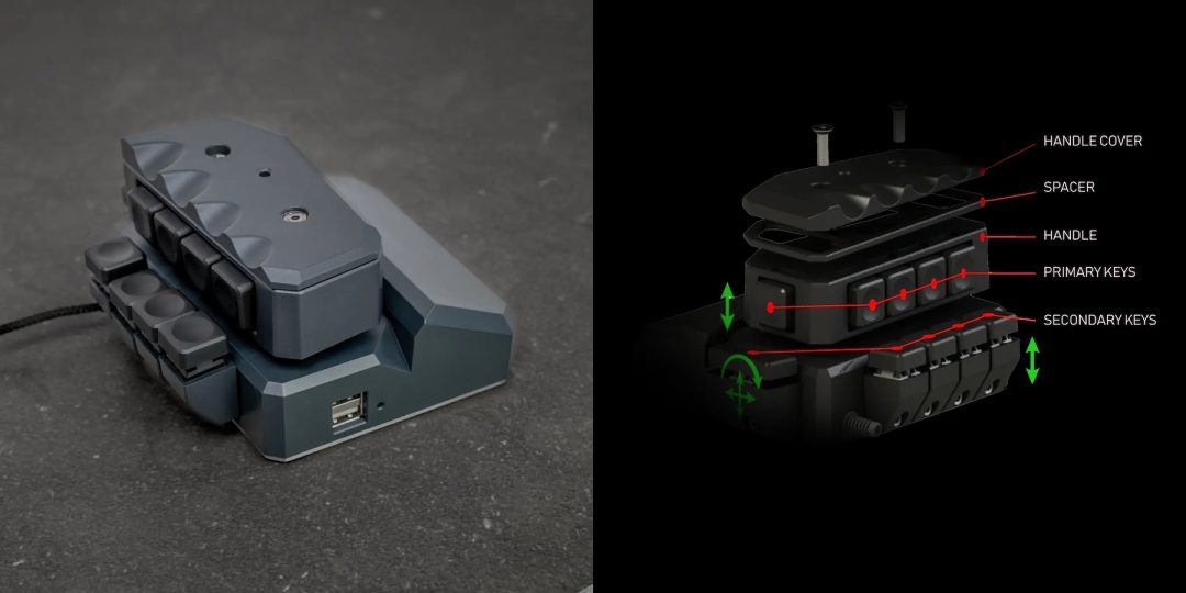 本製品には、ハンドル上の4つを含め、計14個の物理ボタンが人間工学に基づいて配置されている。グリップを握った状態で、全ボタンへ瞬時に指が届く設計となっているそうで、プレイヤーの手に合わせたサイズ調整にも対応するという。また、プログラマブルボタンとして、複雑なマクロ設定やキーバインドに対応する。スイッチはCherry MX Silentが採用されている。