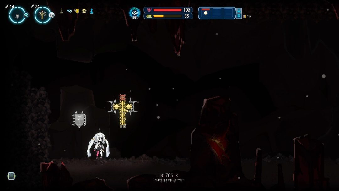 二つ目の新要素は「能力アップマス」だ。本アップデート後は、武装クラフト時に特定の能力が向上する能力アップマスがランダムで出現する。これにともない、一撃のダメージを重視したビルドにも取り組みやすくなったほか、より優れた武装を求めて試行錯誤するパズル的な楽しみも生まれている。本作には「後半になるにつれて敵が硬く感じられる」との意見が多かったそうで、相対的にプレイヤーの攻撃力を伸ばしやすくなる形で対応したという。なお能力アップマスは本アップデートにあわせてデモ版にも実装されている。