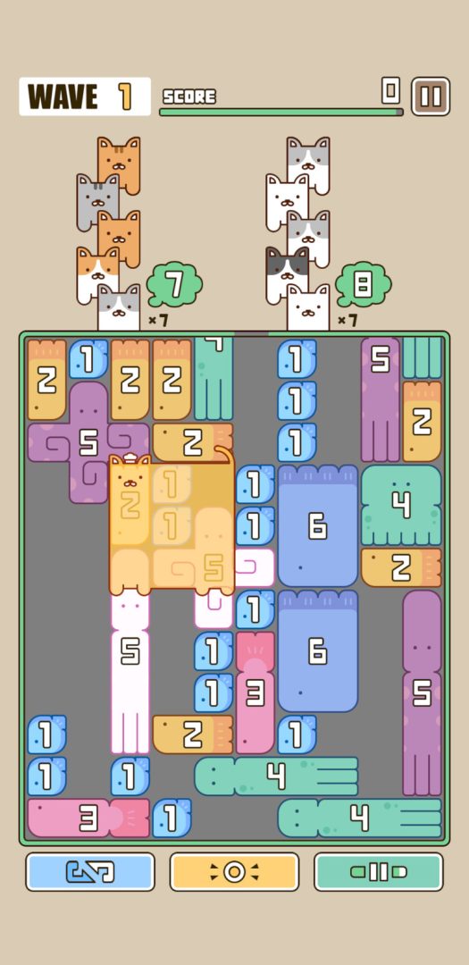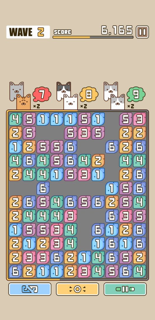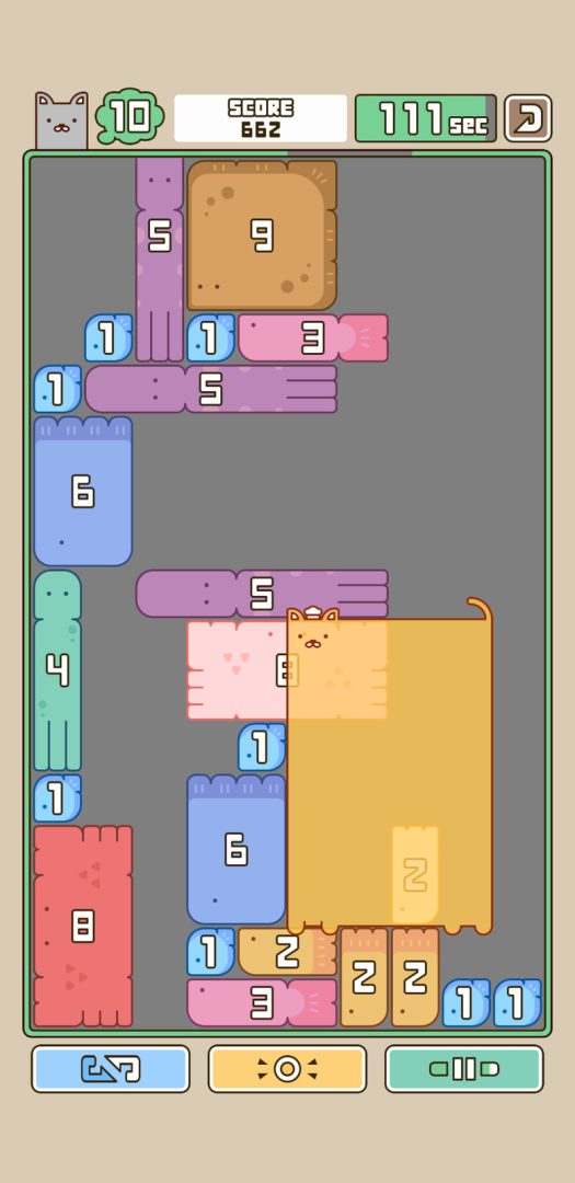 本作では2種類のモードが設定可能。デフォルトの「ねこてん」モードでは、「1」なら1マス、「4」なら4マスというように、数字の大きさがそのままブロックの大きさとなる。画面を指でなぞると四角形のねこが出現し、触れているブロックをまとめて消すことができる。見た目の直感でサクサク囲んで消していけるというのが特徴だ。また「クラシック」モードも用意され、こちらでは各数字がすべて1マスのブロックとなる。