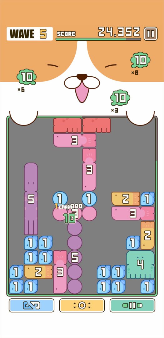 またゲームは2種類収録され、「ぺこねこRUSH」では画面上部からねこが押し寄せるWAVE制を採用。プレイヤーはそれぞれのねこが要求する数字と合計が一致するようにブロックを消していく。「MAKE10 RUSH」ではより広い画面が用意され、合計がちょうど10となるようにブロックを囲い続け、時間の許す限りスコアを稼ぐのだ。連続して消していくとチェーン(CHAIN)となり、より大きなポイントを獲得可能。次々と降ってくる新しいブロックを瞬時に把握してチェーンを続けるためには、思考力や反射神経も求められる。