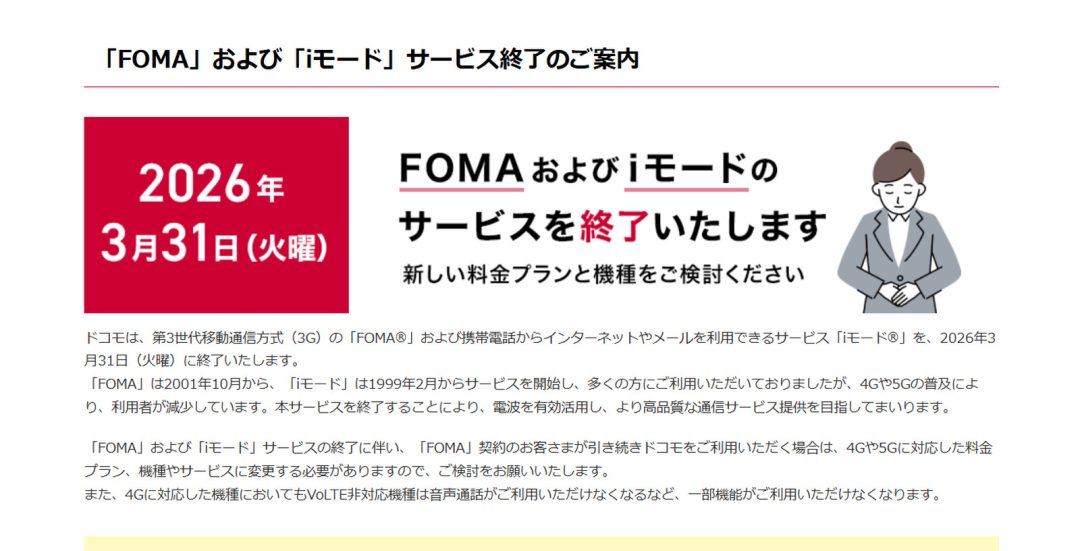 一方で、契約数が減少するなかで第5世代移動通信方式(5G)に経営資源を集中させるため、第3世代移動通信方式(3G)の「FOMA」とともにサービスを終了すると発表。2019年9月に新規受付が停止され、2021年11月には「iモード公式サイト」のサービスが提供終了に。そして本日2026年3月31日、iモードの全サービスが終了となる(NTTドコモ)。
