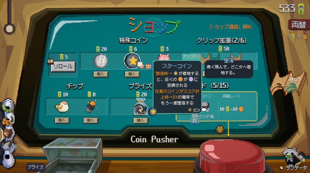 本作ではコインプッシャーにてコインを落とすと、ポイントと同時にチケットも獲得できる。ラウンド間に訪れるショップではチケットで特殊コインを購入でき、プレイ中に任意のタイミングで投入可能。周囲のコインを変化させるなどして獲得ポイントをアップさせたり、爆発するなど特定のアクションが発動したりなど、ユニークな効果を持つ150種類の特殊コインが存在する。