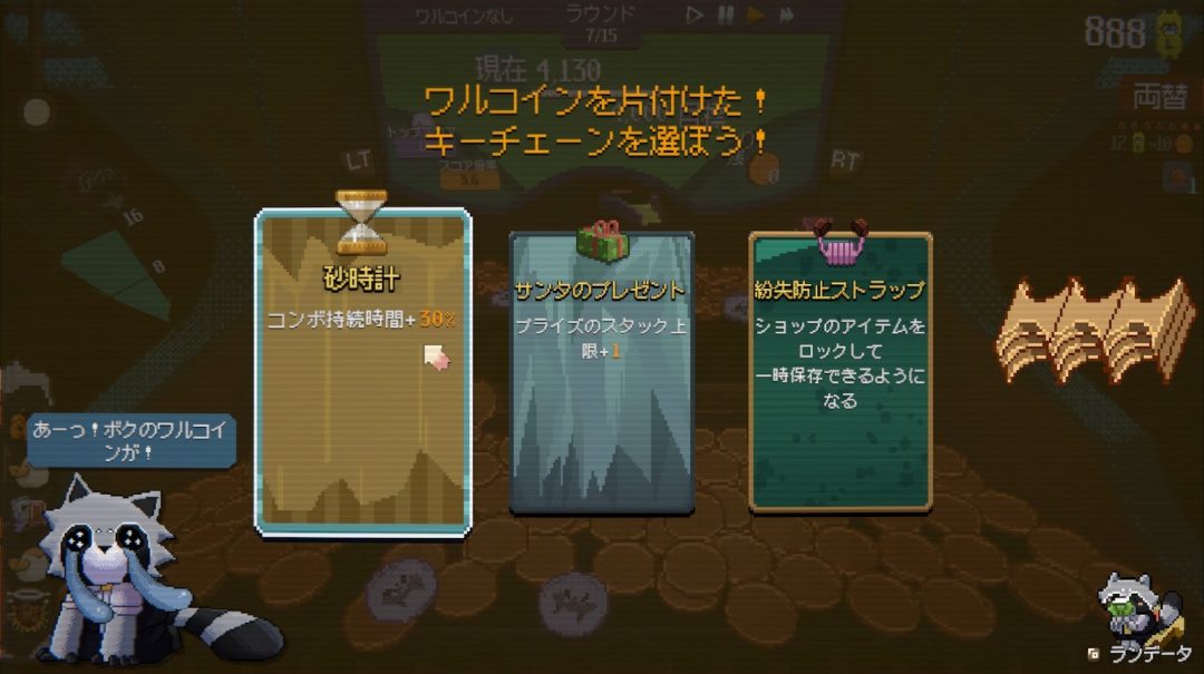 また、3ラウンドごとに筐体に自動投入されるワルコインの存在も特徴のひとつ。これは、接触したコインの価値を下げるなど負の効果を持つコインで、落としたり特殊コインの効果を使ったりして排除すると、ラウンドクリア後にランダムに3つ提示された中からアップグレードを獲得できる。