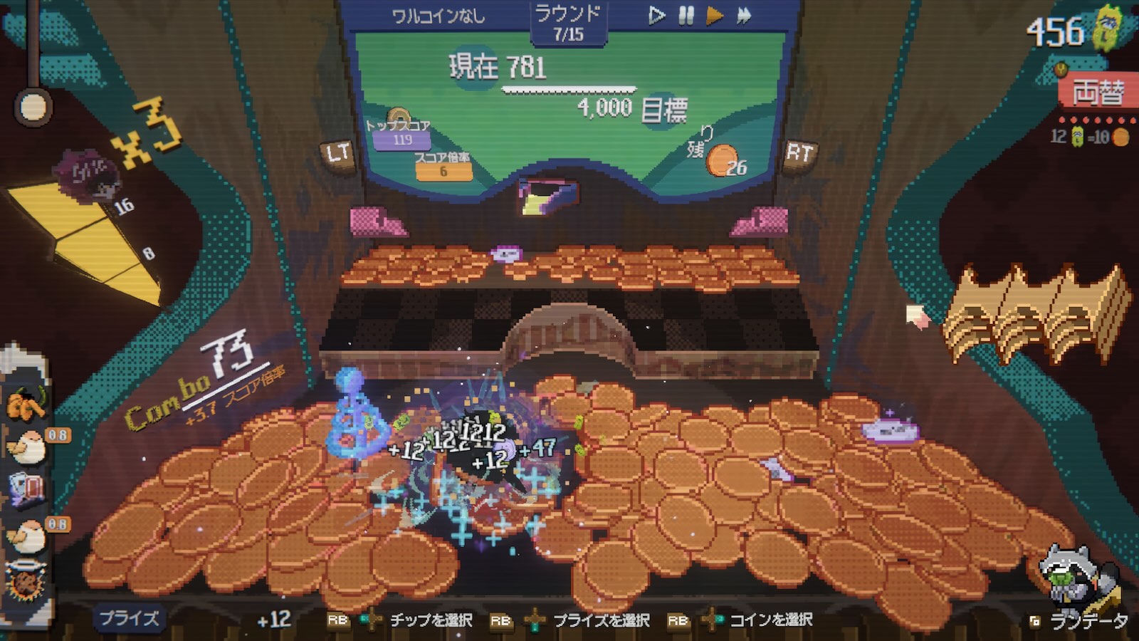 ラウンドを進むごとに、クリア目標ポイントはどんどん上昇していくため、こうした特殊コインなどのアイテムの効果やシナジーを活かして獲得ポイントを増やしていくことが求められる。連続してコインを落とすコンボによるボーナス要素も存在し、うまくハマれば獲得ポイントはインフレしていくことだろう。