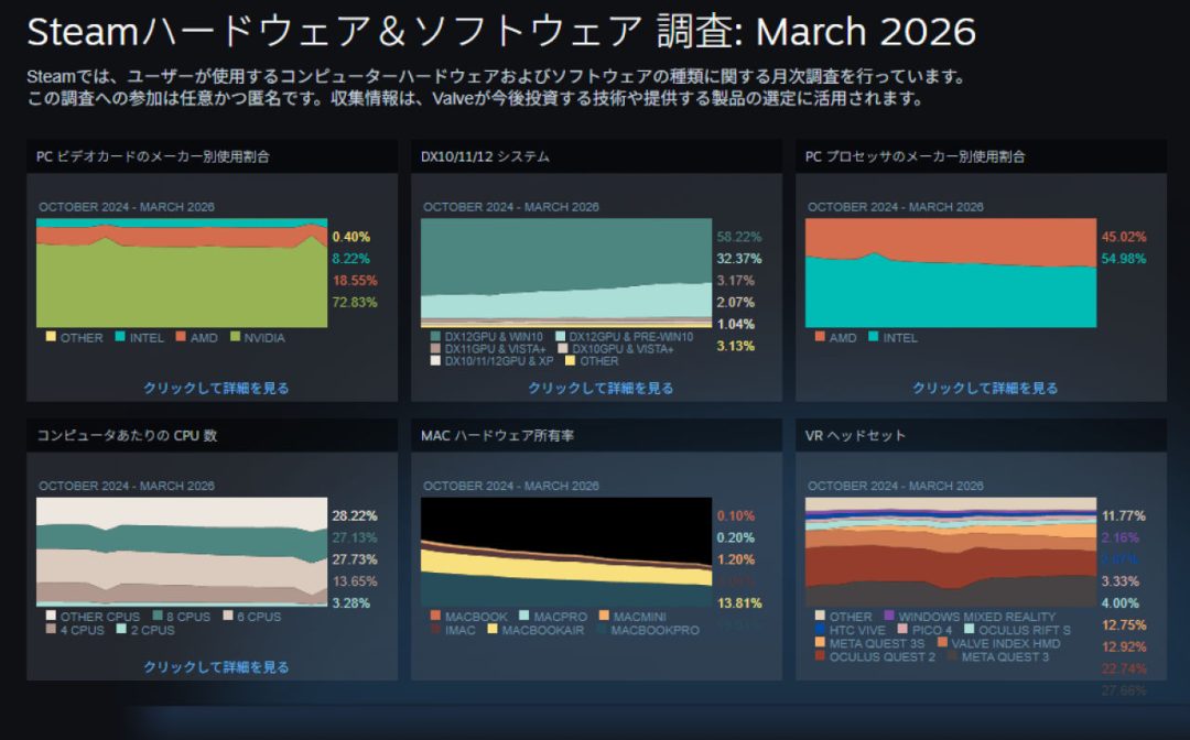 Valveは4月2日、「Steamハードウェア&ソフトウェア 調査: March 2026」を公開した。システムメモリのユーザー割合に、2月からの大きな変動が見受けられる。