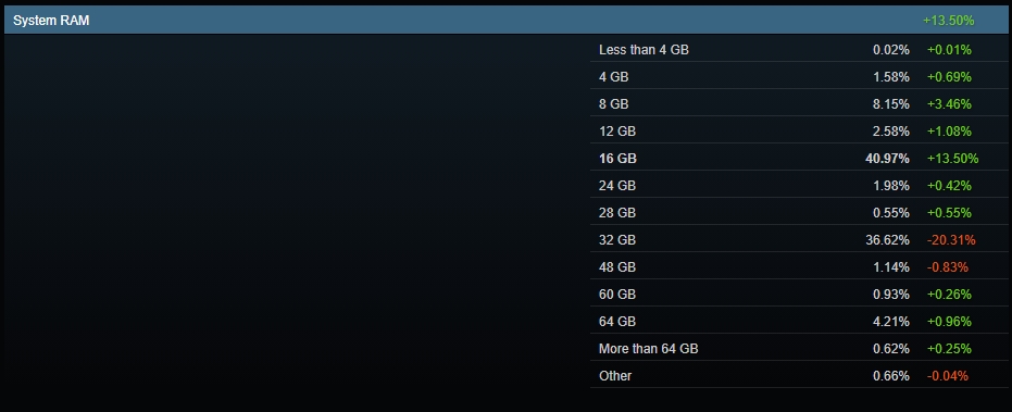 そして今回の「Steamハードウェア&ソフトウェア 調査: March 2026」では、システムメモリについて興味深い傾向が見受けられる。3月にもっとも多かったのはメモリ16GBのユーザーであり、その割合は40.97%。そしてメモリ32GBのユーザーが36.62%で続いている。