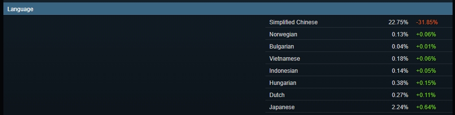 ちなみに中国では政府の認可を受けたタイトルのみプレイできる中国語版のSteamが展開されているものの、VPN接続によってグローバル版のSteamを利用するユーザーが多いようだ。ただVPN接続で国外のウェブサイトにアクセスすることはあくまで中国内では違法であり、当局による規制が強化されている可能性も報じられている(朝日新聞)。今年はSteamハードウェア&ソフトウェア 調査においての2月から3月にかけての简体字ユーザーの減少割合が昨年よりもやや大きく、そうした状況も一因となっているのかもしれない。