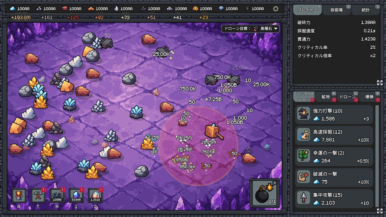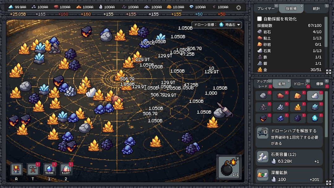 『無限採掘場 気づいたら世界破砕』は採掘をモチーフにしたクリッカー系のゲームだ。自らのツルハシやドローンの自動採掘などで鉱石を集め、手に入れた資源で装備をアップグレード。最終的に世界そのものを破砕することを目指す。