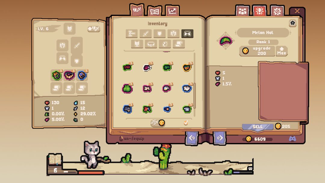 ステージとしては、草原や砂漠など6つのバイオームが存在。自動的に進行するものの、先へ進むほどに敵は強くなり、ステージ最奥にはボスも待ち受けている。レベルアップや装備品の強化をしないと先へ進むのは難しく、力尽きた場合は自動的に最初のステージから再開となる。PCで作業をしながら、冒険を進めて大量の装備を集め、自分だけの最強の猫ヒーローを作り上げるのだ。