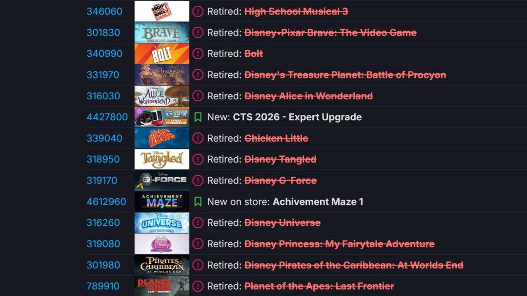 Steamにて4月14日、ディズニーがパブリッシングを行っている複数のゲームが突如として販売を終了したことが明らかとなった。現時点で配信停止が確認されているタイトルは14作品に及ぶが、配信停止に到った理由や再配信の有無については不透明な状況となっている。