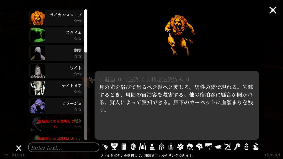 たとえば本作におけるワイトは、この世に未練を遺した霊魂であり、道連れを求めて死者に憑依しているのだという。ワイトは寡黙で、ほかの宿泊客に視線を向け、宿全体に寒気を振りまくといった特徴をもつ。宿泊客の多くが寒さを訴えている場合には、ワイトなど寒気に関連したニセモノが紛れ込んでいる可能性があるわけだ。本作では宿屋に現れた兆候や宿泊客の証言などをもとに、誰がニセモノなのか、どのモンスターが紛れ込んでいるのかを推理。観察と情報の整理によってニセモノを追い出し、宿屋を運営していくわけである。