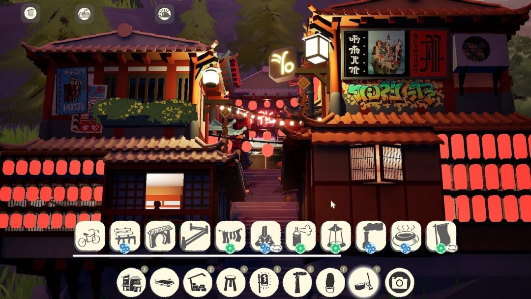 建物などのオブジェクトは、各ステージに合わせて用意されたものを利用。なお、アンロック済みのすべてのオブジェクトを自由に活用できるクリエイティブモードも収録されている。ステージは、比較的狭い土地である場合が多く、建物は縦方向に増築することも可能。接し合う建物同士は馴染むようにデザインが自動調整され、密集した雑多な雰囲気を表現できることが本作の特徴だと言える。