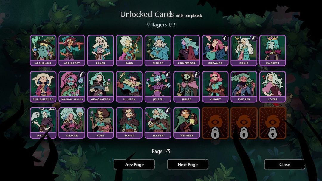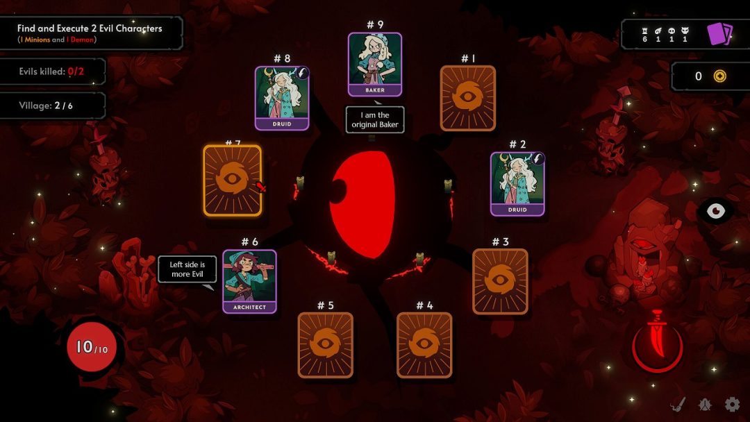 ゲームプレイは、盤面に並ぶキャラクターカードから得られる情報を手がかりに、一定数の悪魔たちを特定し、処刑していく流れだ。登場するキャラクターは「Lover」や「Confessor」など100種類以上におよび、それぞれ固有の能力を備えている。たとえば「Enlightened」は、最も近い悪が時計回りか反時計回りのどちらに位置するかを調べることができ、「Judge」は任意のキャラクターを選び、その発言の真偽を見抜くことが可能だ。こうした能力で得られる情報を頼りに、悪魔たちを炙り出していく。