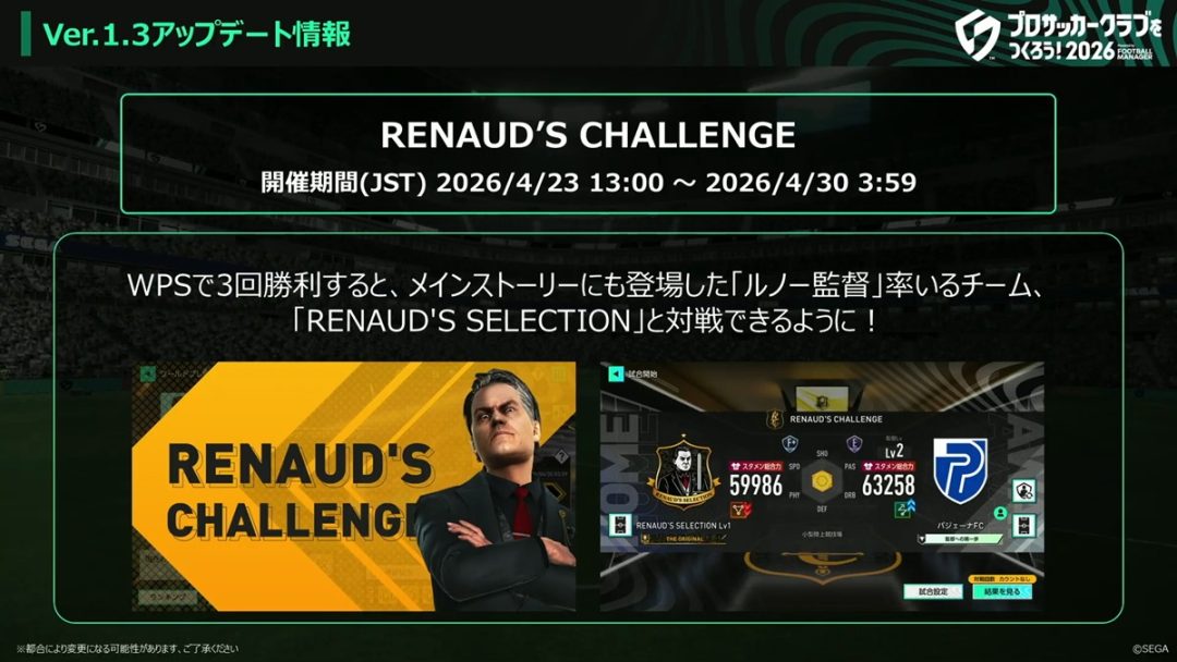 Ver.1.3の新イベントのひとつが、「RENAUD’S CHALLENGE」だ。本イベントは、WPSで3回勝利することで、メインストーリーにも登場したルノー監督率いるチーム「RENAUD’S SELECTION」と対戦ができるようになるというもの。なお、ルノー監督との対戦はWPSの試合回数を消費せずに対戦できるそうだ。また、RENAUD’S SELECTIONのチーム総合力は、倒すごとに徐々に強くなっていくとのこと。どのレベルのRENAUD’S SELECTIONを倒せるのか、というチャレンジイベントとなっており、最終的にレベル20まで用意されているという。RENAUD’S CHALLENGEは、4月23日のVer.1.3アップデートメンテナンス終了後より開催予定だ。