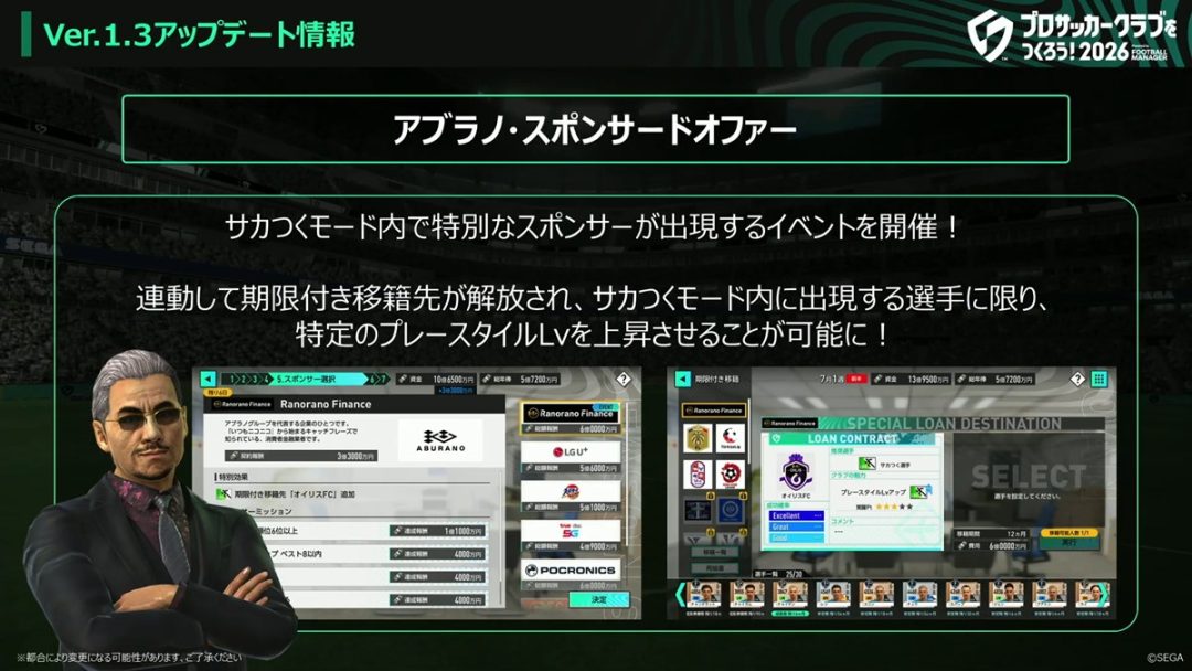 そして、もうひとつの新イベント「アブラノ・スポンサードオファー」は、「サカつくモード」内で特別なスポンサーが出現するというイベントとなっている。連動して期限付き移籍先が解放され、「サカつくモード」内に出現する選手に限って、特定のプレースタイルLvを上昇させることが可能なイベントだ。