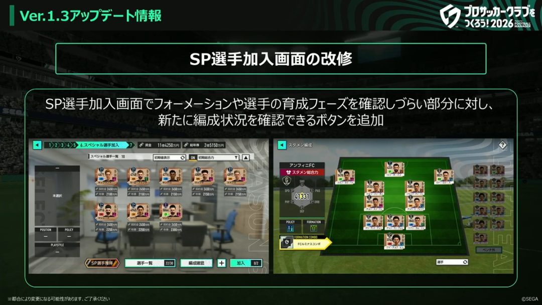 セガは4月20日、『プロサッカークラブをつくろう!2026』の公式番組「サカつくTV #7」を放送した。番組は「Ver.1.3アップデート生放送」と題し、次回アップデートで追加される予定の新要素が発表された。