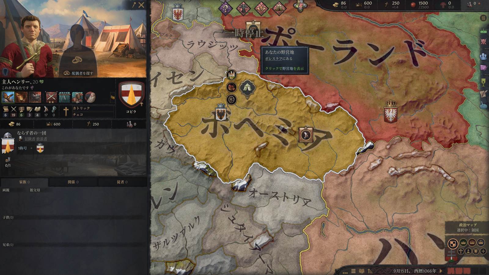 そんな本格的な歴史ゲームとして人気を集めている両作が、今回コラボレーションを実施した。『CK3』向けの内容としては、『KCD2』の主人公であるヘンリーがゲーム内に登場している。ヘンリーは自らの領地をもたない冒険者として登場し、ゲーム開始時点ではボヘミアのボレスラフに野営中。家名はコビラ家となっており、性格特性として慈悲・勇敢・憤怒を所有している。カッとなりやすいところはあるが、勇気と優しさを兼ね備えた優秀な戦士といった設定だ。またライフスタイル特性として剣士見習いと熱心な酒好きを所持しているほか、認知された庶子の特性も保有。さらに逸品レベルの武器であるラジク・コビラ卿の長剣を最初から所有している。