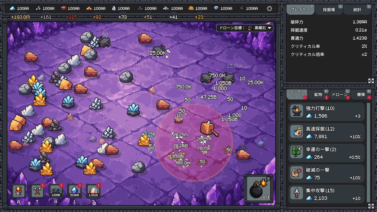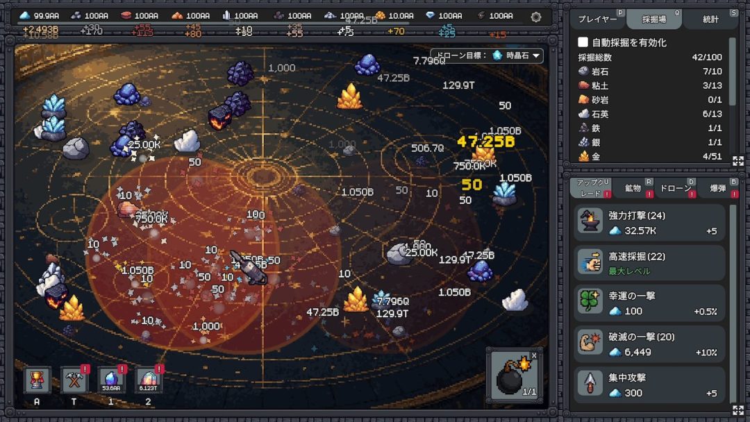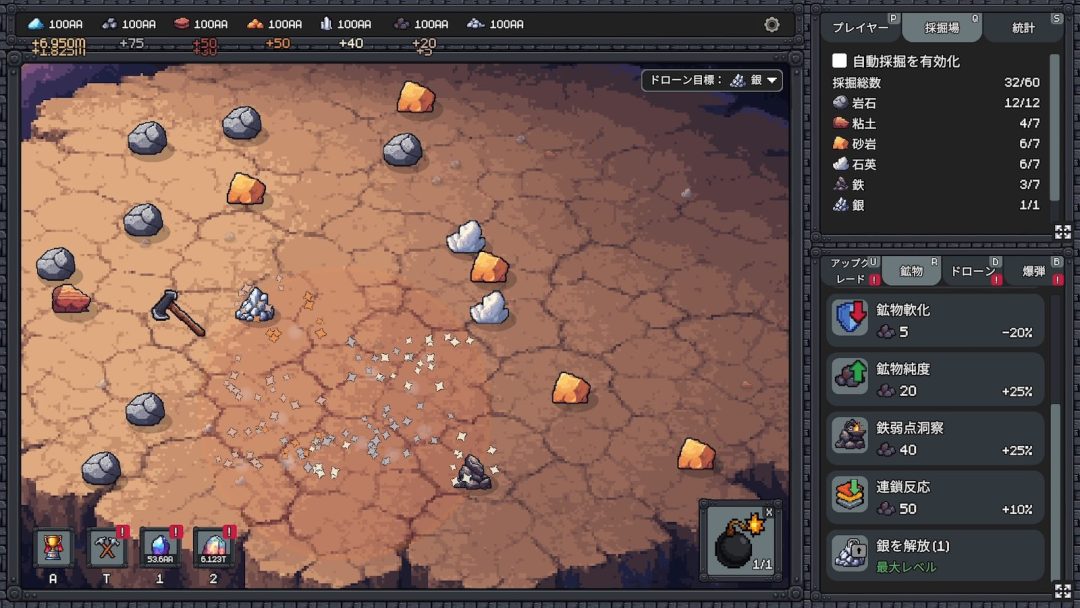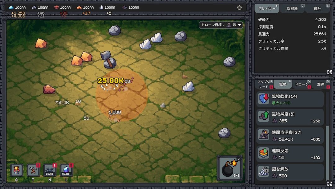 本作は、鉱石の採掘をテーマにしたクリッカーゲームだ。ゲーム内は日本語表示に対応している。