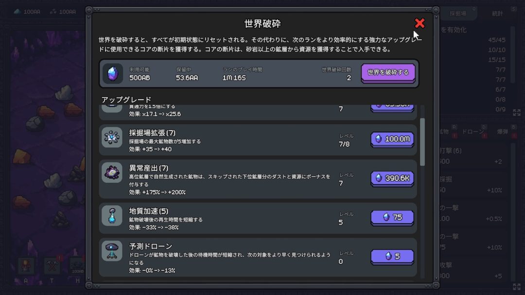このほか、世界を破砕してゲームを初期状態にリセットできる要素も存在する。リセットすると、それまでのゲームプレイに応じて特別な資源を獲得し、鉱石をより素早くたくさん採掘できるようになる各種アップグレードをおこなえる。つまり、世界破砕するたびに、さらに強化された状態からゲームをやり直せる仕組みだ。