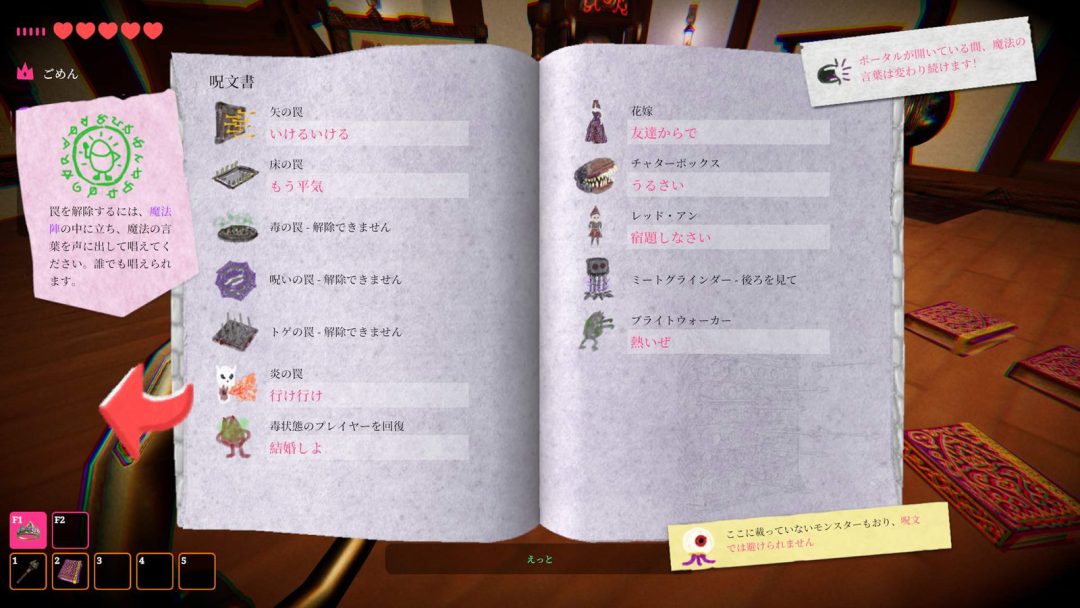 ゲームプレイは、拠点からランダム生成されるダンジョンに挑み、3日間の間にお宝を持ち帰ることが目的となる。アイテムの一つとして呪文書があり、呪文書にはそのほかのアイテムを使用するための言葉、モンスターを撃退する言葉、罠を解除する言葉が記載。たとえば回復杖を持って「愛してる」と言えば仲間を回復、「うるさい」と言えば対応するモンスターを撃退、魔法陣に立って「もう平気」と言えば対応する罠を解除できる。ただし、呪文は一定時間で変化するうえに、呪文書に載ってないモンスターは撃退できない。最初に用意される呪文書は限られているため、常に誰かが呪文書を持ち、現在の呪文を把握することが重要となる。