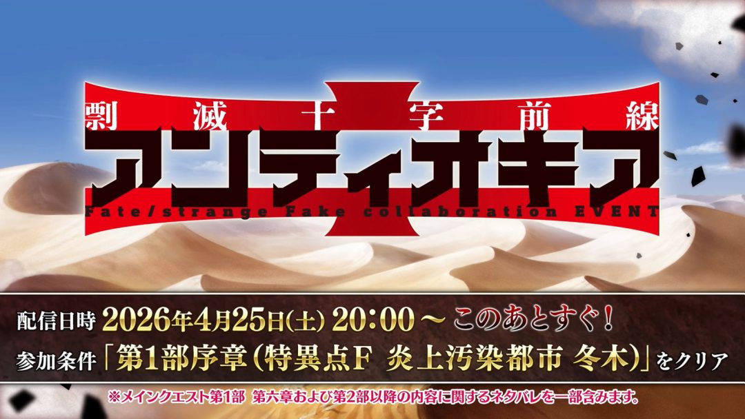 FGO PROJECTは4月25日、『Fate/Grand Order(FGO)』の最新情報を公開した。「Fate/strange Fake」とのコラボイベントとなる「剽滅十字前線 アンティオキア」は、本日20時より配信される。