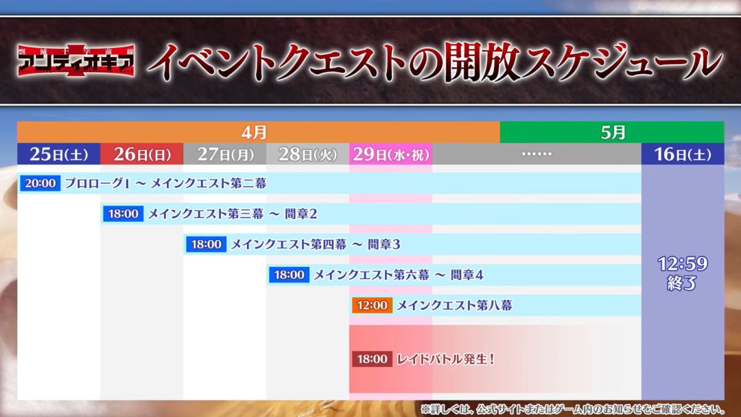 イベントの配布サーヴァントとしては、星4ライダーとしてヒッポリュテが登場。メインクエストを進めていくと、正式加入させられる。新サーヴァントとしては、星5キャスターとしてフランソワ・プレラーティ(フランチェスカ・プレラーティ)が登場し、、バトルキャラの性別によって変化する要素が用意されているそうだ。また4月29日18時よりレイドバトルが開催予定とされている。