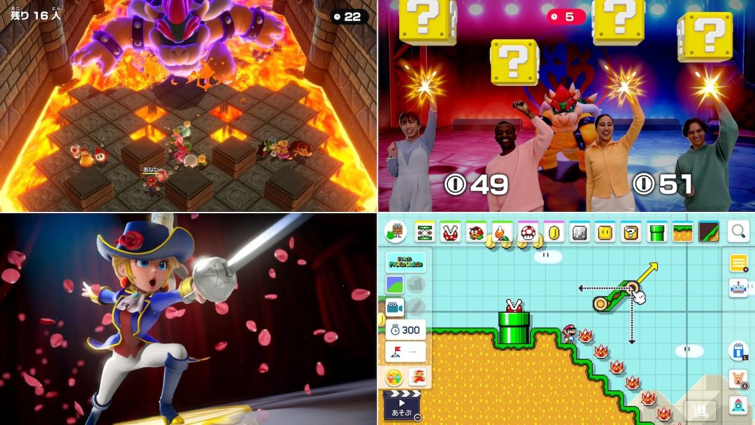 ・『スーパーマリオ』のコースを自由に作って遊べるゲーム。ソロプレイおよび最大4人でのローカル・オンラインマルチプレイに対応。100種類以上用意されたパーツを組み合わせてオリジナルのコースを作成でき、ルートに配置してワールドを作ることも可能。また、同シリーズ各作品をモチーフにした見た目や操作を導入するシーンスキン・ゲームスキンといった機能も収録されている。