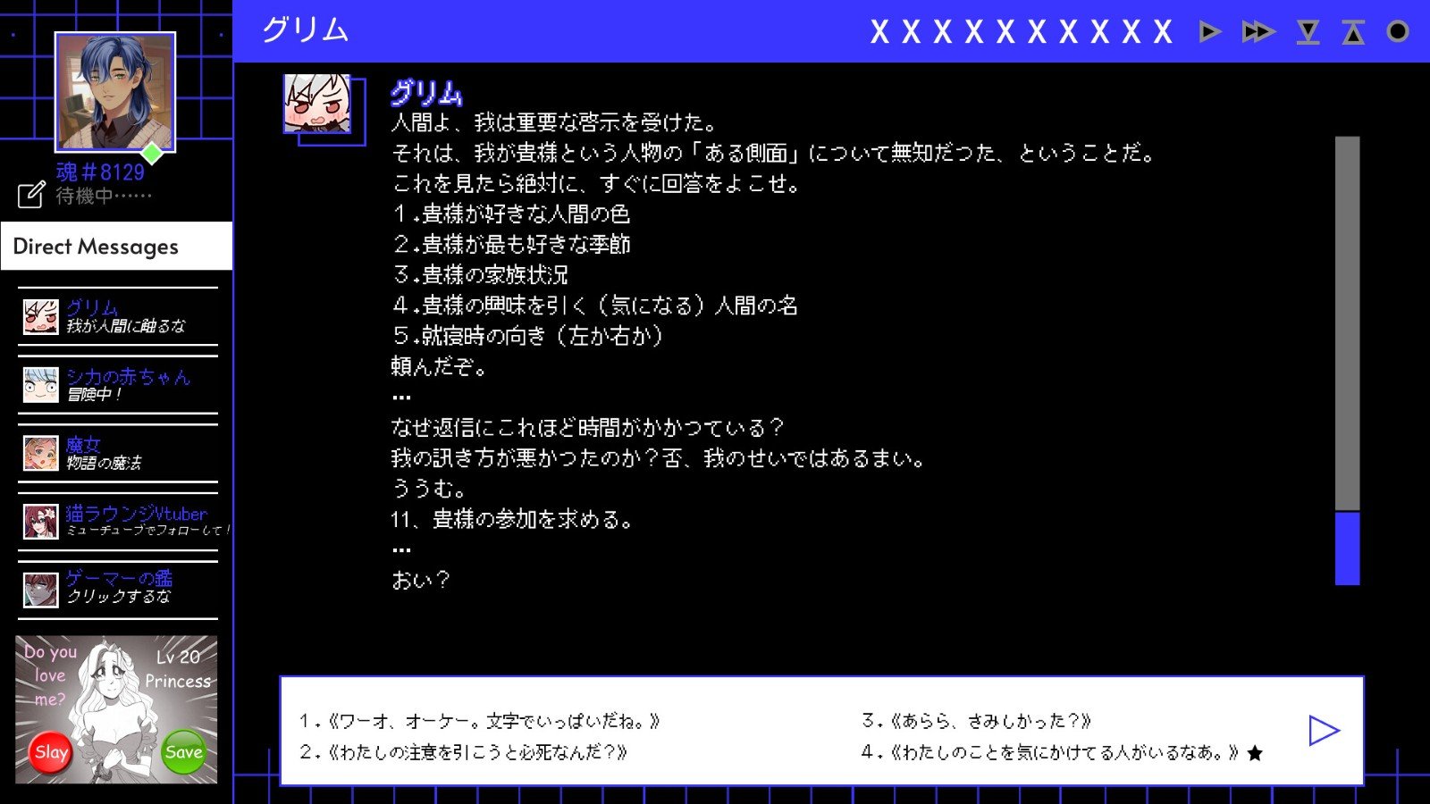 死神とのやりとりでは、選択肢から返答などを選んでコミュニケーションをおこなう。選択によって異なるエンディングへとつながり、死神との関係も変わっていく。そして死神とやりとりする主人公の見た目はキャラメイクが可能。多彩なパーツで外見を変更できるだけでなく、一人称や名前も変更可能。なお主人公の見た目はゲーム中にも変更が可能だ。