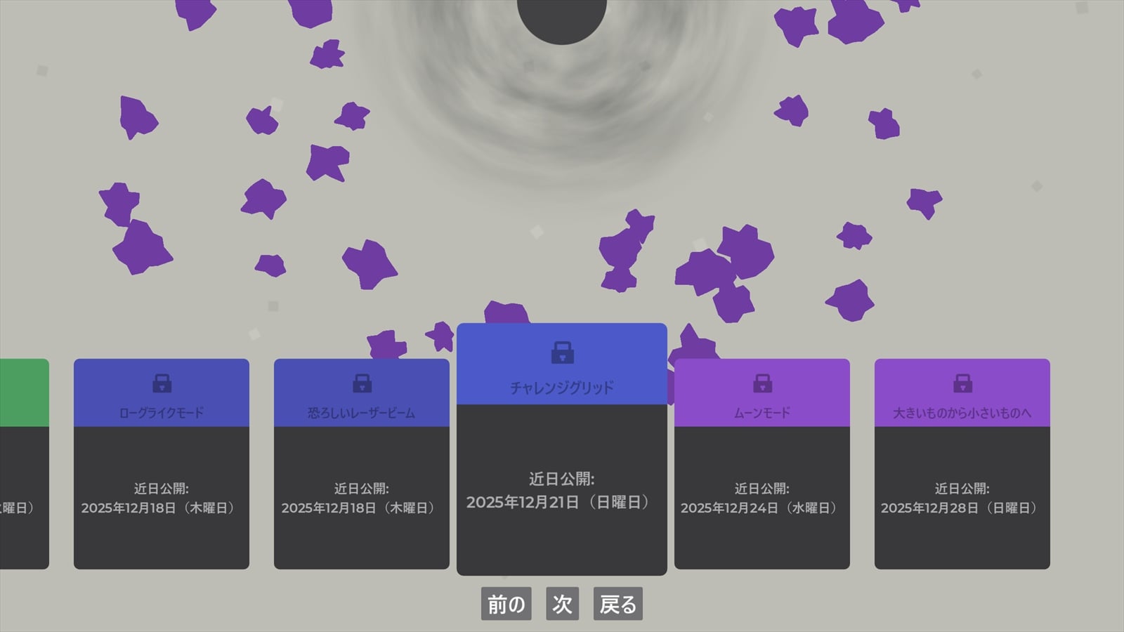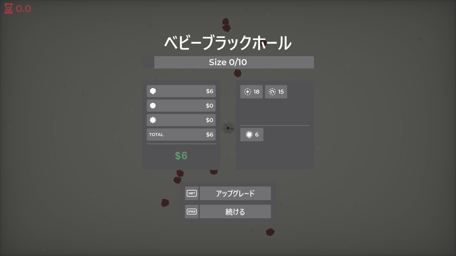本作は、ブラックホールに小惑星を与え大きくしていく放置系ゲームだ。画面中央に小さなブラックホールが、その周辺には小惑星が浮遊している。プレイヤーは小惑星を砕き、ブラックホールに吸い込ませることで資金を獲得。アップグレードを購入し、限られた時間でどこまで大きくできるかを目指していく。