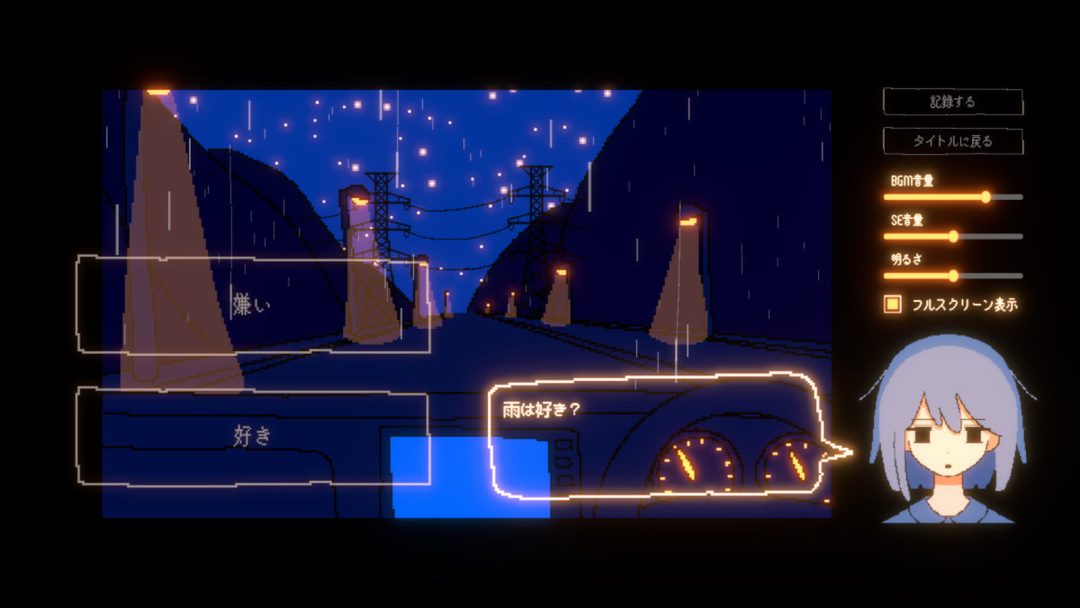 謎の少女との不確かなドライブは、ポイント&クリック型のアドベンチャーゲームとして展開される。本作でプレイヤーは、どこか陰鬱な少女と会話していく中で、言葉を選ぶこととなる。曖昧でぼんやりとしたドライブは、選んだ言葉によって4つの結末へと分岐。本作では静かな夜のドライブが、4つの結末によって描かれるのだ。また全エンディング後には、もう一つの終わりが用意されている。何が少女と主人公にとって正しかったのか。答えはプレイヤーの心のなかにだけあるそうだ。メーター類の明かりだけが車内を照らす、静かな夜のドライブを表現した画面構成も特徴だろう。