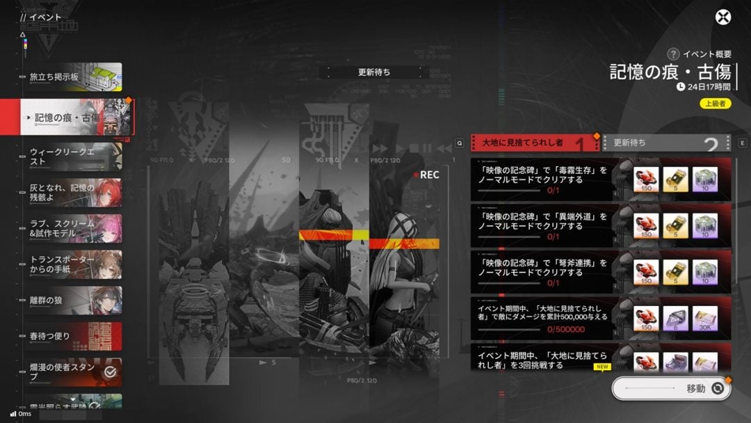本作においては、エンドコンテンツとして「映像の記念碑」が存在する。周期更新のバトルコンテンツであり、強敵と戦いガチャ石を含めたさまざまな報酬を獲得できる。同コンテンツ内では期間限定でイベントが実施。第一弾として「大地に見捨てられし者」シリーズが2月12日に実装された。オペレーターの育成や戦闘理解を問う、エンドコンテンツに相応しい難易度である。そして続くコンテンツ「無機的造物」は、2月26日に実装予定であった。