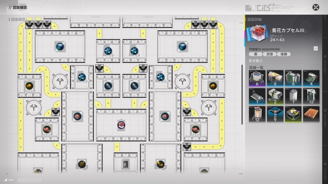 なおコミュニティでの生産ライン圧縮活動に関しては、明文化されていないもののある程度のルールや前提は設けられているようで、生産効率が最大であることや、倉庫搬出口を最小限に抑えるといった“レギュレーション”が存在している模様。いずれも分間6個の蕎花カプセルIIIを生産しており、25×45マス以下のサイズであれば中枢エリアでは3セット配置することも可能という点でも注目されている。