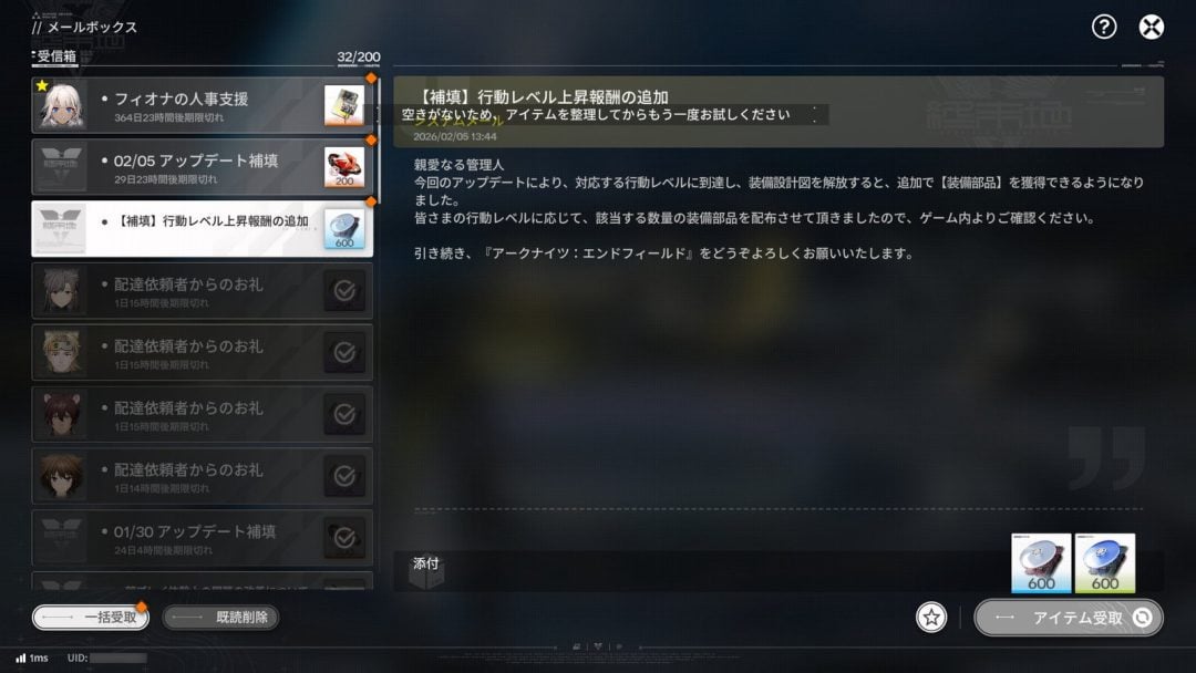 『アークナイツ:エンドフィールド』運営からサービスで「装備部品」が送られるも、みんな受け取れず戸惑う。突如手持ちに押し寄せる1200個アイテム