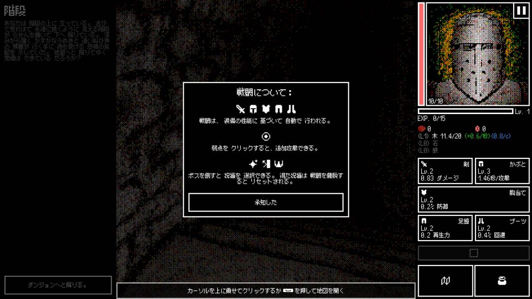 ダンジョンはオートバトルで進行し、1フロアごとに9体の雑魚敵と1体のボスが待ち受けている。装備品の攻撃力や防御力、回復力や回避率に基づいて、自動的に戦闘がおこなわれ、HPが尽きるか撤退を選ぶと拠点に戻るかたちだ。稀に表示される弱点をクリックという介入要素も用意されている。レベルアップすれば次のランにも引き継がれるHP上限が増え、ボスを倒すとそのランのみの祝福というパワーアップを3択から選ぶことも可能。また、倒した敵から入手した資材によって、拠点の資材上限をアップグレードできるため、ダンジョン攻略を繰り返すことでどんどん強化できるように可能になっていく。