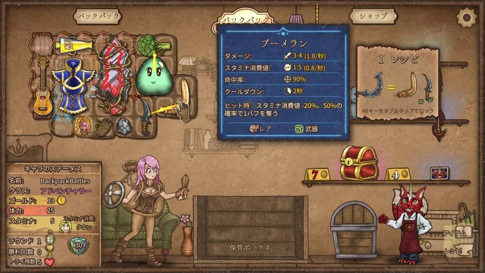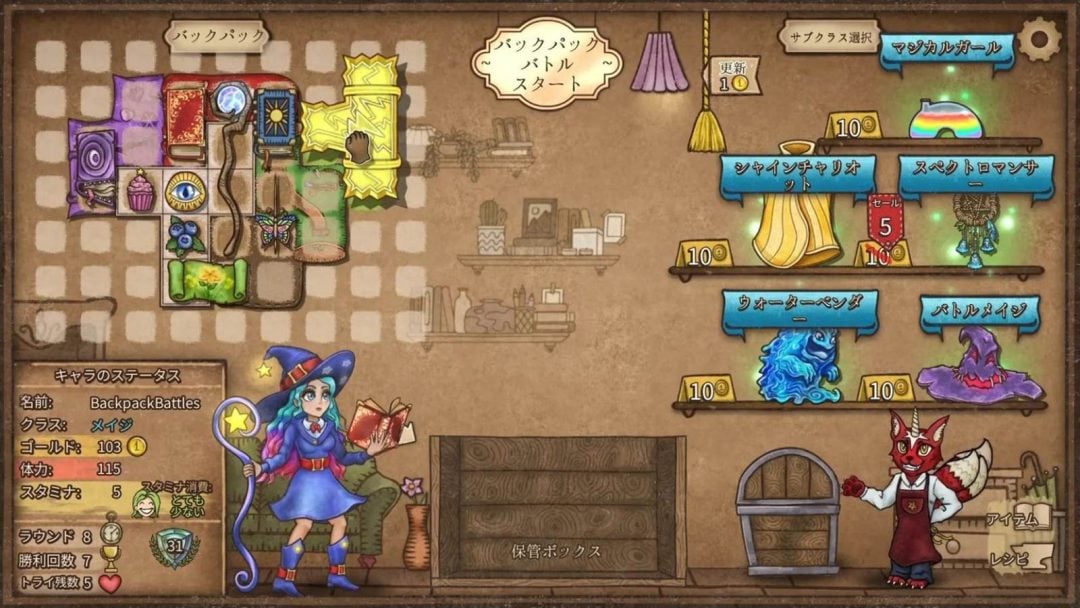 『バックパック・バトル』は非同期型の対戦ゲームだ。PC版の日本向けパブリッシングは松竹株式会社が手がけており、ゲーム内は日本語表示に対応している。プレイヤーはショップにてアイテムを購入し、バックパックへ収納。限られたスペース内に賢くアイテムを詰め込んで自身を強化し、自動で進行するバトルの勝利を目指す。