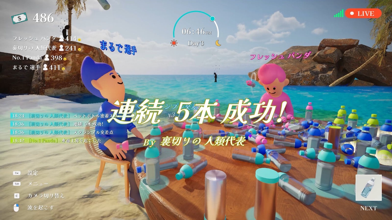 本作は、孤島にてボトルフリップの映像配信をしてお金を稼ぐゲームだ。ボトルフリップとは、液体の入ったペットボトルをクルッと回転させて投げ、テーブルなどに直立させることを目指す遊びのこと。本作では物理演算によって表現される。