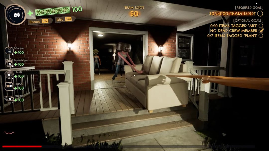 ステージ内に存在する家具や電化製品、芸術品、日用品など、あらゆるアイテムを盗むことができ、それぞれには価値を示す金額と重量、アイテムのジャンルを示すタグが付けられている。それらを盗むには、両手を使って掴み、外に停めてあるバンの荷台まで運ばなければならない。ソファやピアノなど巨大で重いものは、価値は高いが運ぶのは一苦労となるだろう。