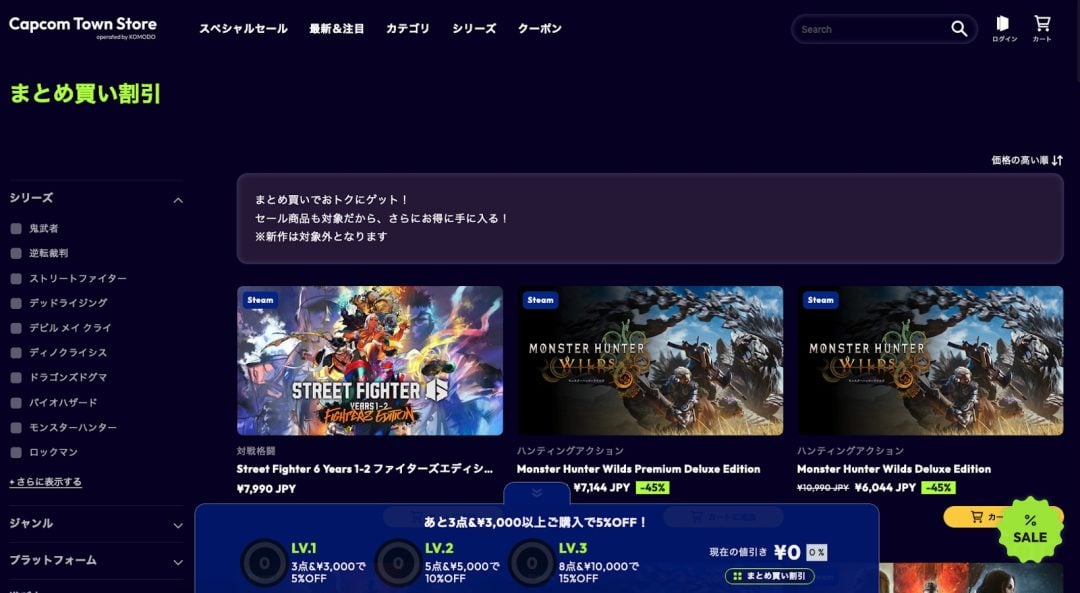 カプコンタウンストアでは、公式ならではの割引販売も実施中だ。まず、「CAPCOM PUBLISHER SALE」が2月26日まで開催されており、人気タイトルが最大87%オフとなっている、また、「まとめ買い割引」では対象タイトルを複数本まとめて購入することで、購入本数と合計金額に応じた割引が適用。段階的に5〜15%の割引となる。上述のセール対象タイトルにも適用でき、さらにお得に購入可能だ。
