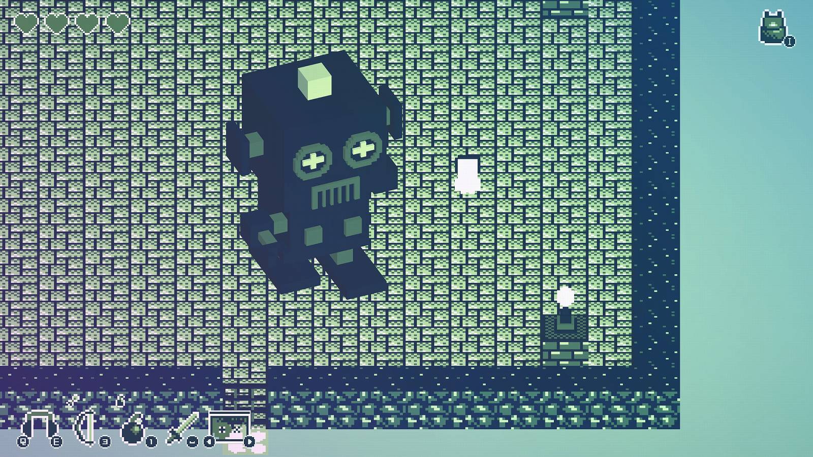 最大の特徴は、視界の有無によって世界の状態が変化する「シュレディンガーシステム」だ。『CASSETTE BOY』の世界は一見2Dドット絵風だが、実際には立体的な3D構造になっており、プレイヤーはマップを回転させながら進んでいく。画面に映っていない物体は“存在しないもの”として扱われ、さっきまで進路をふさいでいた障害物や、目の前にいたモンスターさえも、視界から外れた瞬間に消えてしまう。逆に、画面内に入れれば通路や足場が現れ、先へ進む道が開ける。本作はこの視界操作による状況変化を軸としたパズル要素に加え、モンスターとの戦闘や武器の入手を含むRPGとしての手触りも備えているのだ。