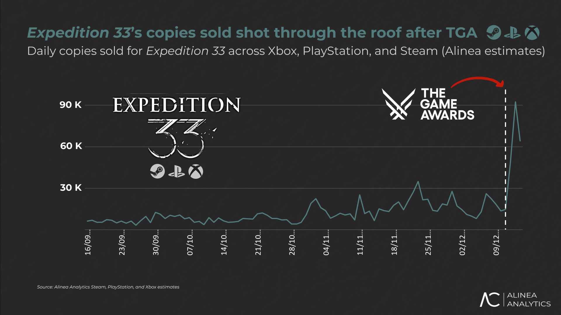 ゲームの市場データ分析会社のAlinea Analyticsは、『Clair Obscur: Expedition 33(クレール・オブスキュール:エクスペディション サーティースリー)』について、GOTY受賞後に追加で20万本の売上を達成したと伝えている。主にSteamとPS5にて、1日当たりの販売本数が6倍にも増加したとのことだ。