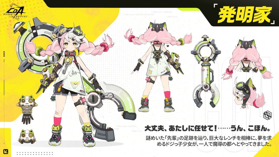『クリスタル・オブ・アトラン』には、それぞれ固有のバトルアクションやスキルを持つさまざまな職業のキャラクターが用意され、それらから選択してプレイする。そして今回のアップデートにて、新職業である「発明家」のジョディ(CV:悠木碧)が正式実装される。多彩で強力な魔導機械を操り、自ら前線に立つよりも、安全圏から敵を殲滅する戦いを得意とする職業だ。
