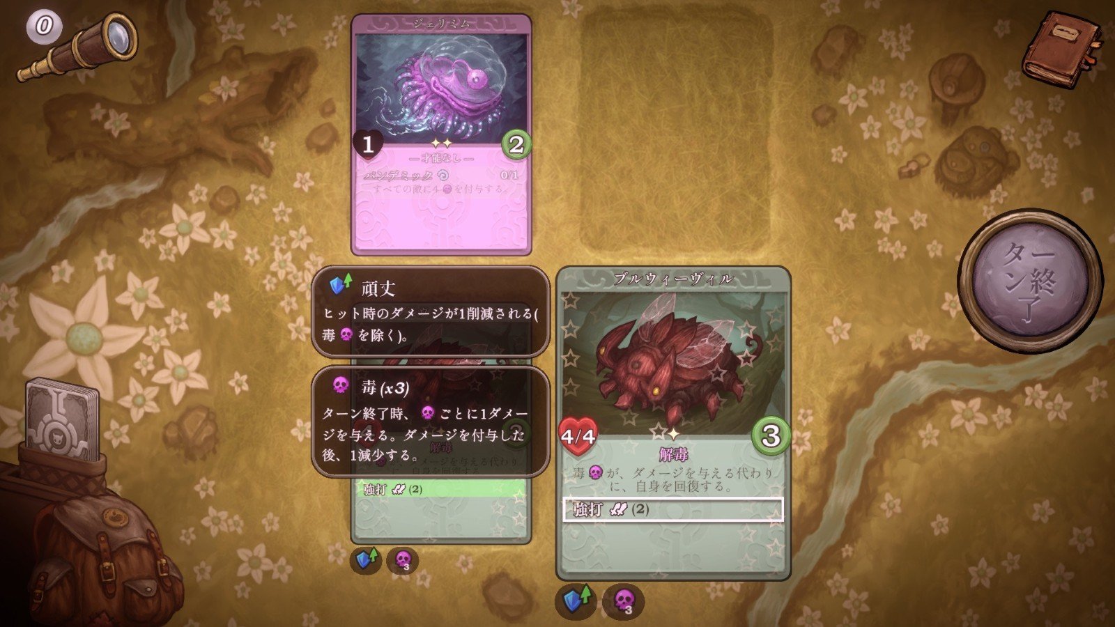 本作ではクリーチャーを使役するモンスターバトルが展開されながら、敵をテイムするという一風変わったデッキの増やし方が特徴。またアイテムを活用することでモンスターを変異させて“カスタマイズ”することも可能だ。戦闘においてはモンスターの体力・攻撃力のほか、スピードに応じた行動順も重要で、ここにモンスターがもつ能力の考慮も必要になってくる。戦闘で撃破されたモンスターはデッキから消滅するため、撃破されずに勝つことも肝要。一方で「1ターン戻す」機能も用意されており、奥深くシビアな戦略性をカジュアルにも遊べるバランスが高く評価されている。