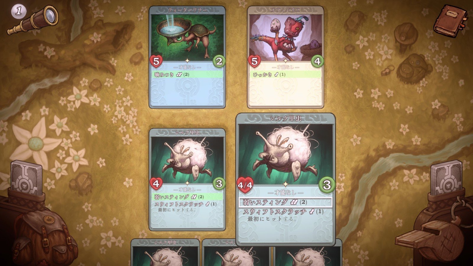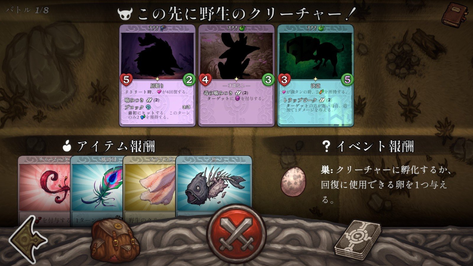 また本作の特徴として、敵クリーチャーは餌カードを用いることでテイム、つまり自分のデッキに加えることが可能。餌カードには肉やベリー、魚などの種別があり、敵クリーチャーの食性次第でより効果を発揮する。