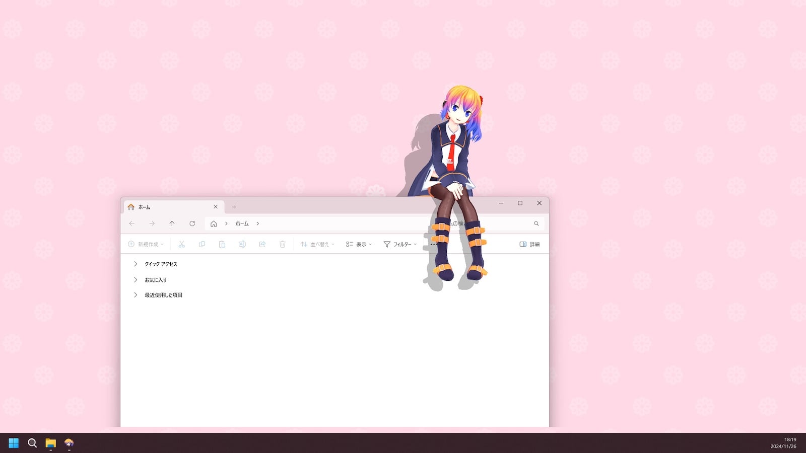 「Desktop Mate」では、3Dグラフィックで表現されたかわいいキャラクターがPCのデスクトップ画面に登場し、タスクバーの上に座ったり寝そべったりしながら、ユーザーのマウス操作を目で追ったり、カーソルに手を伸ばしたりと反応する。また、マウス操作で自由な場所に配置することもでき、ウィンドウの上に座らせルことも可能だ。このほか、アラーム機能が搭載されており、セットした時間になるとキャラクターがお知らせしてくれる。