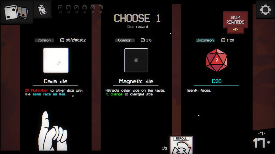 ゲームが進行していくと、面の数が異なるものや、特別な効果を持つものなど、さまざまなサイコロが登場する。たとえば「シンプルな6面」「1か2だけが出る瓶のフタ」「近くに1つだけサイコロがあるときに自身とそのサイコロの出目を倍増させる4面サイコロ」などだ。また、サイコロを振る際に効果を発揮する指輪を装着することができるほか、瞬間的に強い効果を発揮する消耗品のカードも存在する。これらの効果を把握し、うまく組み合わせれば、出目を爆発的に大きな数字にできるだろう。