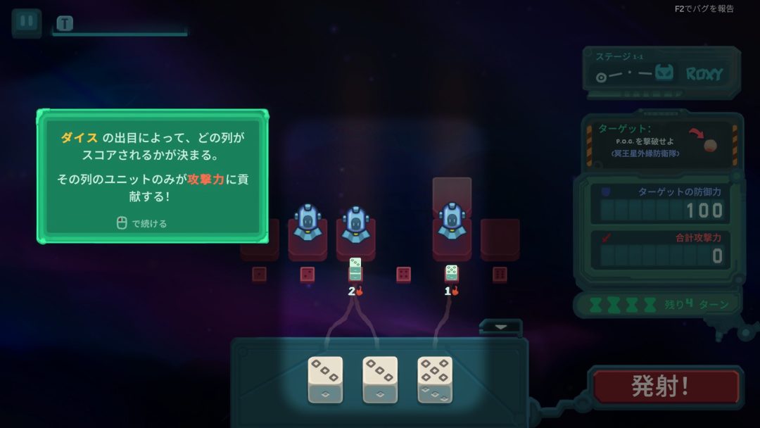 ゲームプレイは、マス目上の部隊編成画面を中心にターン制で進行する。侵攻する太陽系惑星やパイロットには防御力が設定されており、規定ターン以内に部隊を強化して攻撃力が防御力を上回れば侵略成功となる。強化方法がダイスロールとなっており、ダイスの出目は6列の部隊に対応。部隊の各ユニットにはそれぞれに攻撃力が設定されており、出目に対応する列の部隊のみが攻撃力としてスコアリングされる。たとえば出目が1であった場合は、1列目に配置したすべてのユニットの攻撃力でスコアが算出されるわけだ。1ターンに同時に3つのサイコロを振り、出目が悪い場合は「リロール」したり、出目を1だけ上下する「イカサマ」も可能となっている。