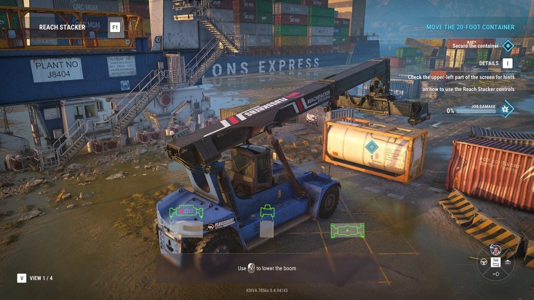こうした業務を支えるのが、港内で扱われる各種重機である。コンテナの積み下ろしでは港湾クレーンを操作し、吊り上げた貨物を所定の位置まで運搬するほか、港内での移動や配置にはリーチスタッカーやトラクターといった作業車両が用いられる。本作は作業内容や状況に応じて重機を使い分けることが重要で、貨物の配置や動かし方を誤れば作業が滞り、ほかの工程にも支障をきたす。そのため、周囲のスペースや荷重を意識した慎重な操作が求められる。
