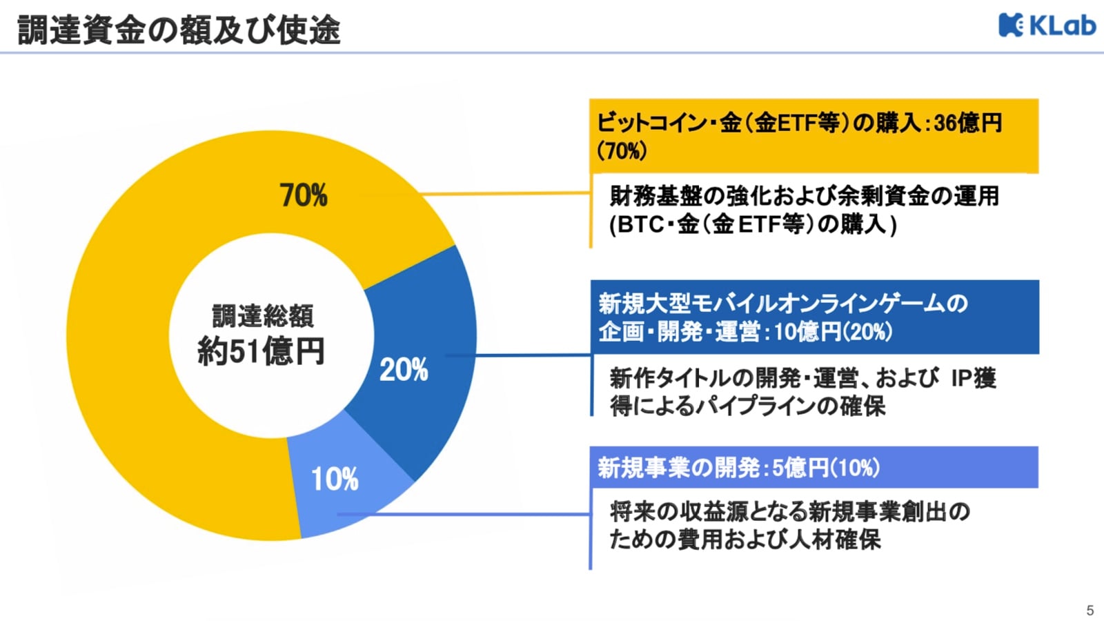 調達資金の使途としては、今年12月から2026年12月までの期間を対象に、新規大型モバイルオンラインゲームの企画・開発・運営に10億円、新規事業の開発に5億円、そしてビットコインおよび金(金ETF等を含む)の購入に36億円とされている。