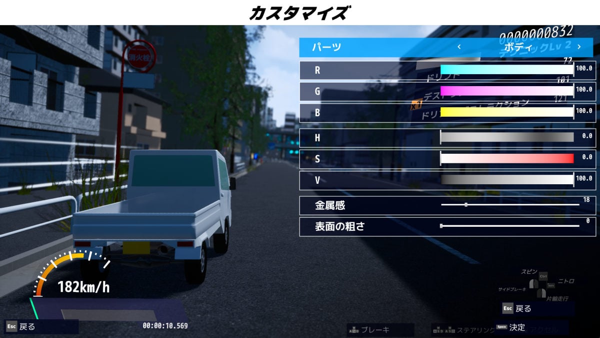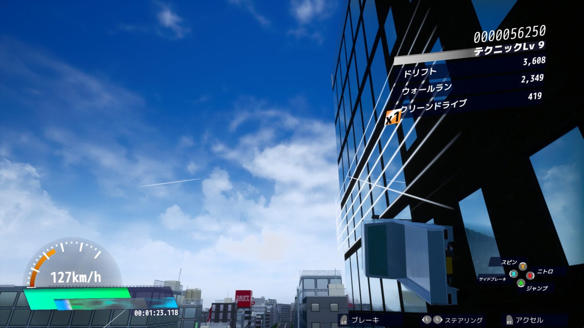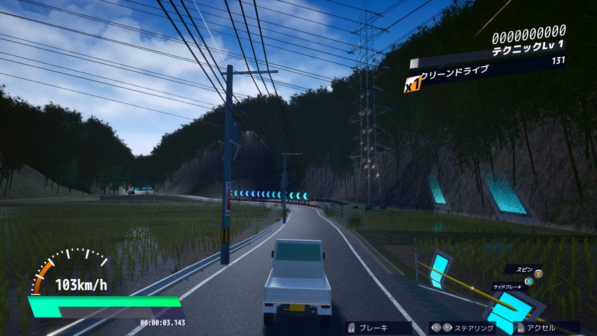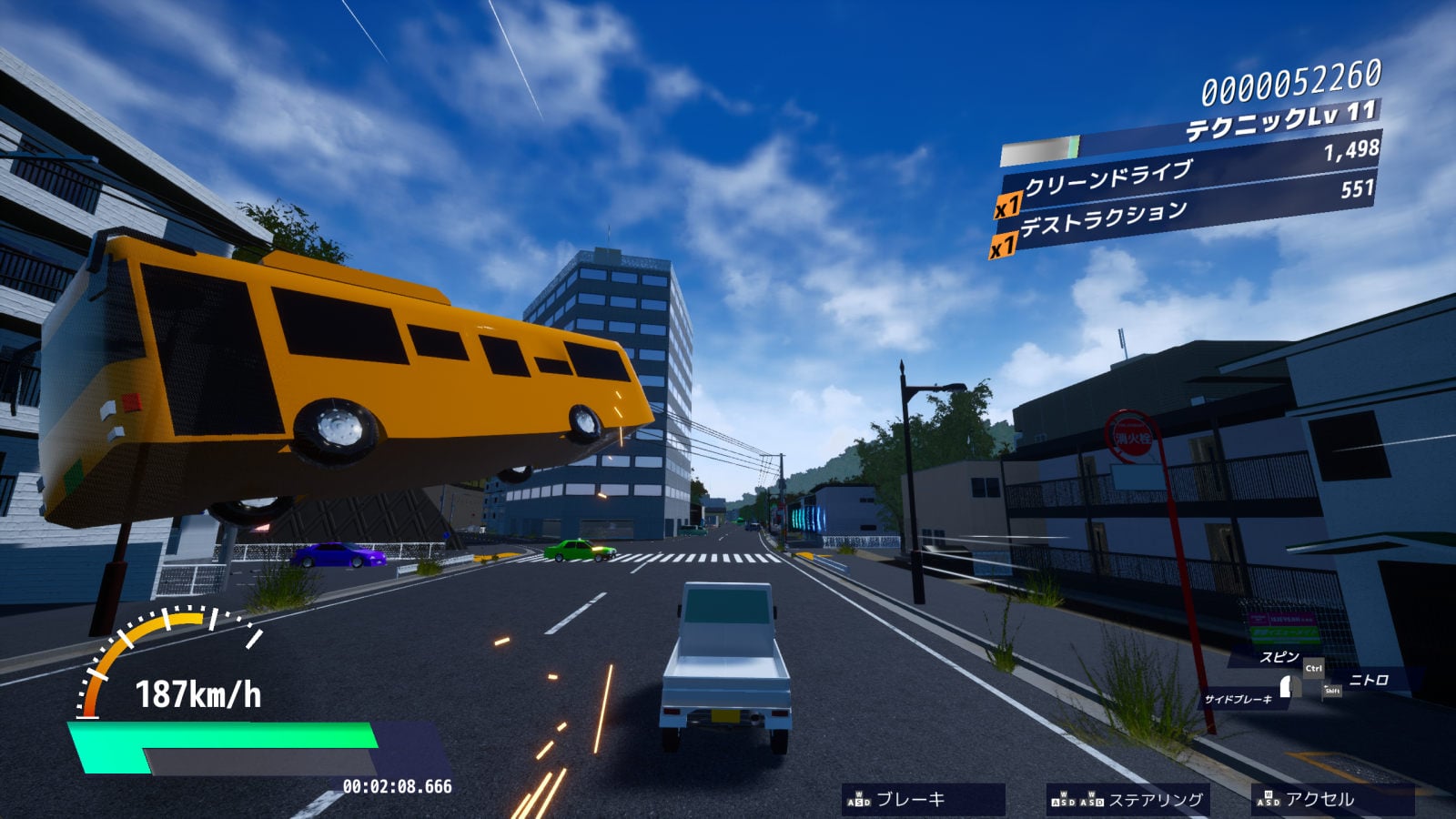 宇宙人の苛烈な攻撃に対して、軽トラックにもさまざまなアクションが用意されている。ハンドブレーキを使ったドリブルはもちろん、片輪走行からの壁走りやスピン、ニトロなどが使用可能。壁からジャンプして壁に移ったり、ニトロとドリフトでコースを素早く駆け抜けたりなど、縦横無尽に無人の日本を駆け抜けられる。また本作の軽トラックは、なぜか非常に頑丈な作りとなっており、電柱やガードレール、街中に放置された車両といった障害物にぶつかると弾き飛ばせる。コース上の物体を破壊すると、どういうわけかニトロの回復も可能。ストーリーモードでは、いくらでも復活できるようになっており、安心してアクセルを踏み倒せる。本作ではステージ上の電柱や車も弾き飛ばしながら、壁走りやニトロで軽トラックを爆走させていく、ハイテンションなアクションが待っているわけだ。